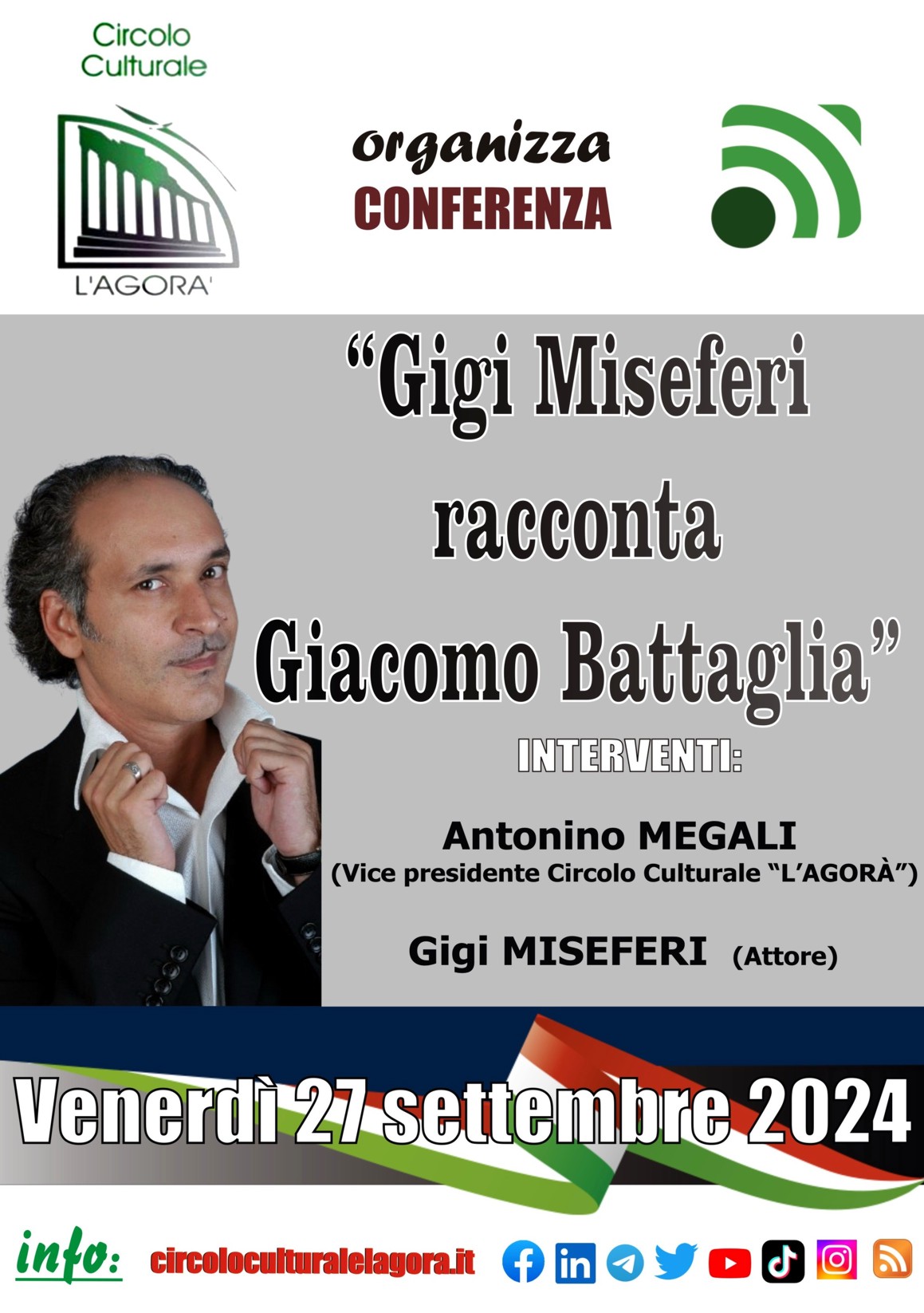 "Gigi Miseferi racconta Giacomo Battaglia" è il titolo della conversazione organizzata dal Circolo Culturale "L'Agorà". Il nuovo incontro, predisposto dal sodalizio culturale organizzatore, ha registrato i saluti di Antonino Megali (Vicepresidente dell’Associazione reggina), la presenza di Gigi Miseferi, intervistato da Gianni Aiello (Presidente del sodalizio organizzatore). Il gradito ospite, compagno di scena ed amico di sempre di Giacomo Battaglia, nel corso della conversazione ne ha ricordato le doti umani ed artistiche. In molti ricordano il due comico reggino formato da Battaglia e Miseferi che tanto hanno fatto sorridere al Bagaglino. Tra le loro imitazioni più amate quelle di Sandro Ciotti e Bruno Vespa. I due sono stati per anni una coppia inossidabile, anche grazie e molti spettacoli teatrali. Conosciutisi casualmente a Reggio Calabria grazie ad amici comuni, iniziano il loro sodalizio artistico a metà degli anni ottanta con una serie di fortunate trasmissioni radiofoniche su delle emittenti locali. Attori, cabarettisti, imitatori e autori. Provenienti dalla Compagnia del Bagaglino di Roma con la quale hanno ottenuto numerosi Telegatti come “migliore trasmissione”, l’ultimo dei quali il Telegatto speciale 2007 per i 20 anni in TV. Prendono parte a tutte le trasmissioni televisive in diretta dal Salone Margherita di Roma a partire dal 1990 in Rai con Crème Caramel fino all’ultima produzione su Canale 5, Bellissima. Nel 1990 approdano alla trasmissione della Rai Stasera mi butto che segna il loro esordio nazionale e li fa conoscere ed apprezzare al grande pubblico televisivo grazie anche agli spettacoli realizzati dalla Compagnia del Teatro Bagaglino, fondata da Pier Francesco Pingitore, di cui diventano membri stabili e dove lavorano a fianco di Oreste Lionello, altro grande reggino dello spettacolo, Pippo Franco, Leo Gullotta. Gli incontri del Bagaglino trasmessi dalle reti nazionali consacrano definitivamente il loro successo.Da allora in poi divengono presenze abbastanza frequenti nei più diversi programmi televisivi così da acquistare una loro fisionomia artistica inconfondibile. Dal 1992 al 1998 sono protagonisti sul palcoscenico del Salone Margherita di Roma con una serie di spettacoli teatrali, come Creme cabaret, Patapumfete , Passata la festa, Tangent insinct Bertoldo Bertoldino e Bertinotti". Nel biennio 1996/97 sono impegnati in tour con Buon pro vi faccia, e sempre nel 1997 il debutto nel mondo del teatro classico con la commedia greca Le nuvole di Aristofane al fianco di Oreste Lionello. Nel 1998 la loro prima esperienza all’estero, in Canada, con lo spettacolo Mediterroni. Seguono diverse produzioni televisive, sia sulle reti nazionali Rai che in quelli della rete Mediaset, Tele Monte Carlo, Video Music, LA7.Ritornano nel mondo dell’etere nel 1998 su RADIOUNO con Le Maschere d'Italia in cui danno voce alle maschere più popolari della commedia dell’arte.Da allora diventano membri stabili della Compagnia del Teatro Bagaglino, dando vita a sketch comici e imitazioni fra le quali ricordiamo quella di Sandro Ciotti e Bruno Vespa. Tifosi sfegatati della Reggina, spesso sono stati ospiti della trasmissione RAI Quelli che il calcio in qualità di inviati per le partite della formazione amaranto. Nel 2013 Battaglia prese parte al programma Comunity - L'altra Italia per Rai Italia, condotto da Benedetta Rinaldi, nella puntata dedicata alla Calabria, presentando il suo libro Racconti in Amaranto . Queste alcune delle cifre che sono state oggetto di analisi, nel corso della giornata di studi organizzata dal Circolo Culturale “L’Agorà”. La conversazione, organizzata dal sodalizio culturale reggino, sarà disponibile, sulle varie piattaforme Social Network presenti nella rete, a far data da venerdì 27 settembre.